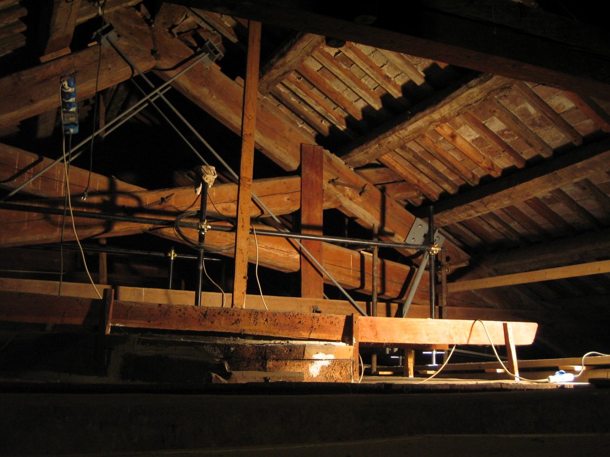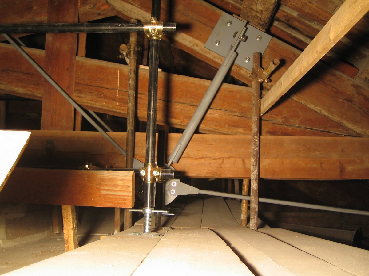 Consolidamento di capriata lignea della copertura esistente sul salone della pinacoteca mediante accoppiamento con capriata metallica.