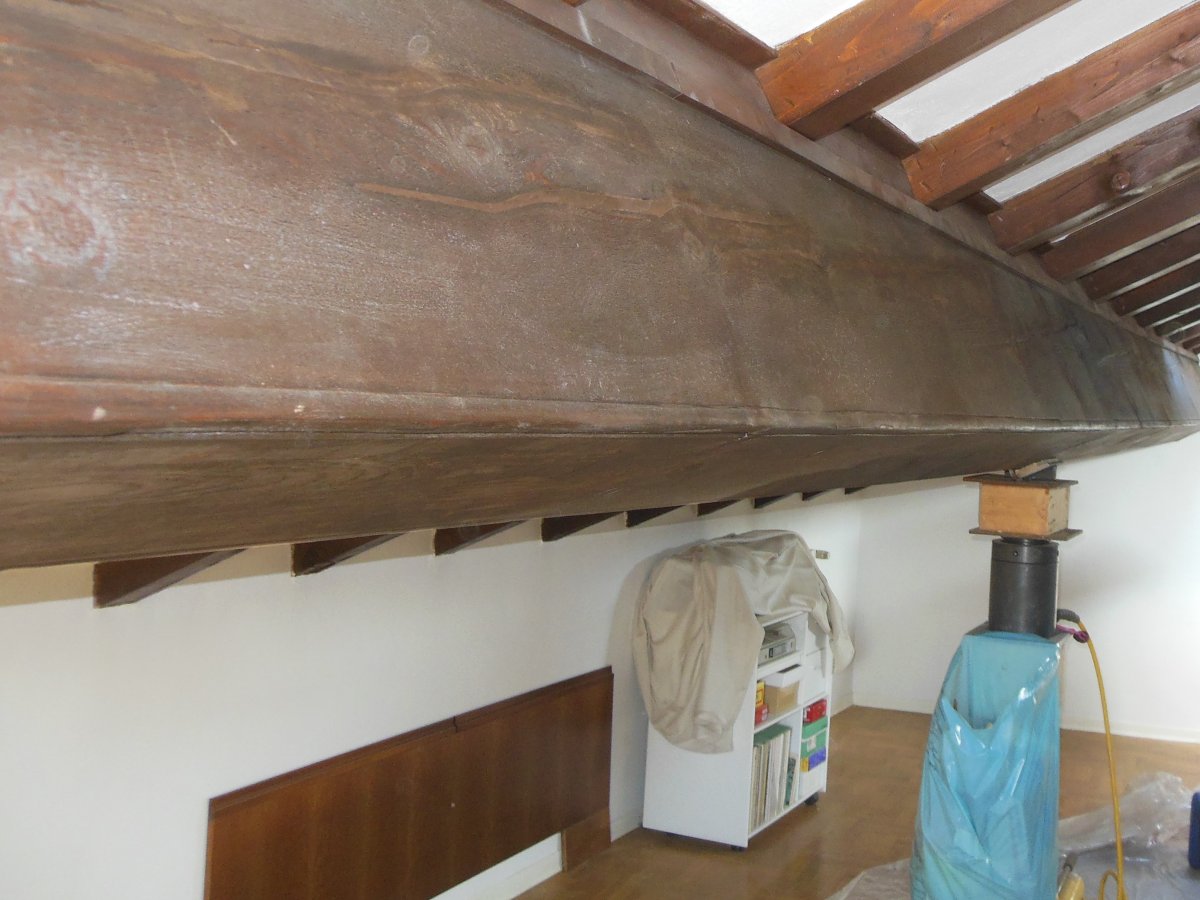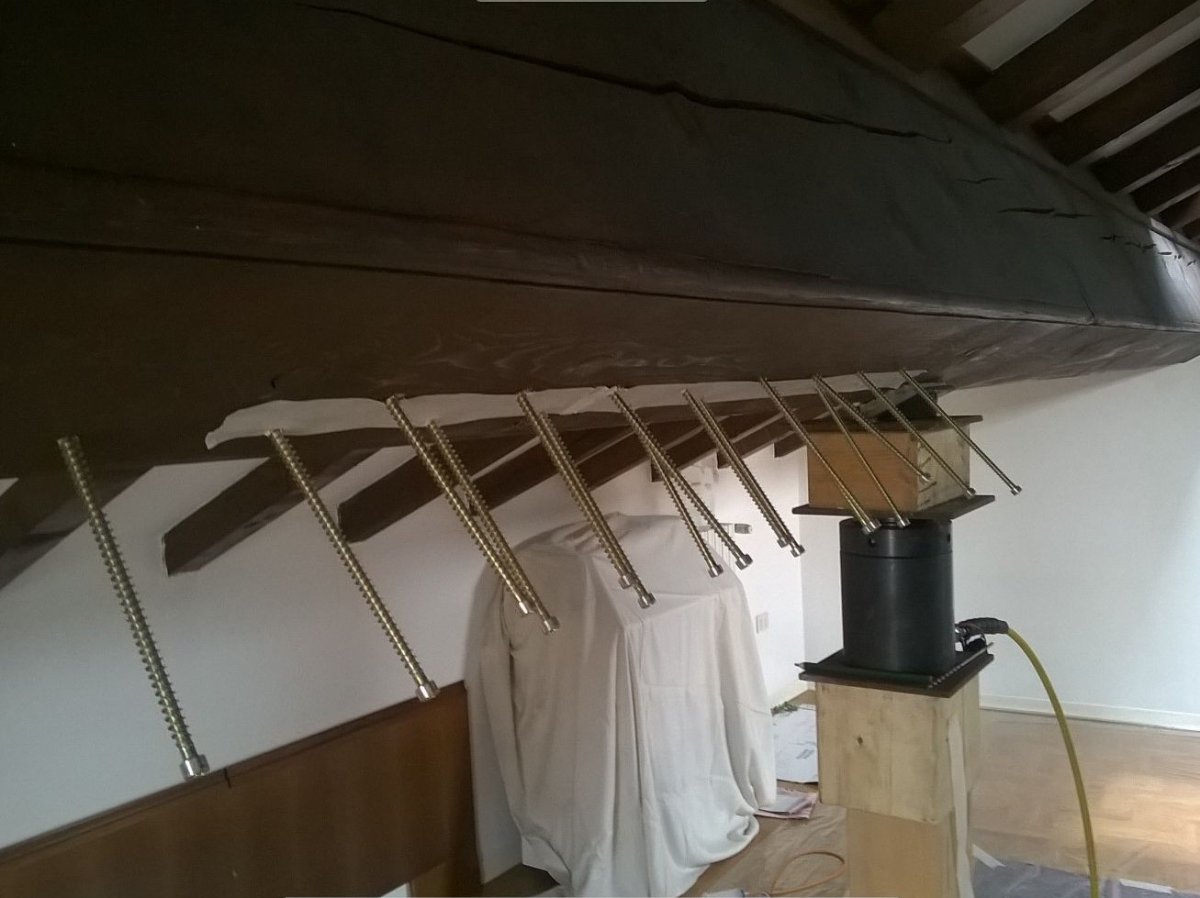 Consolidamento trave in legno con cucitura armata costituita da viti strutturali e resine epossidiche.