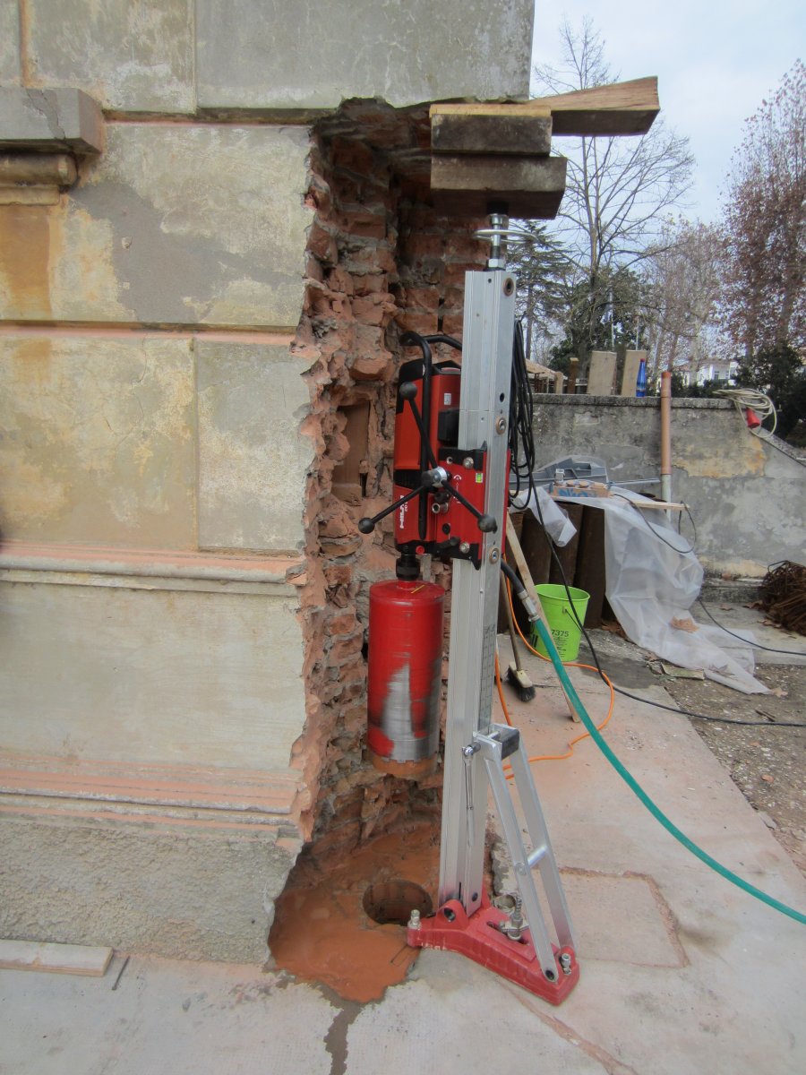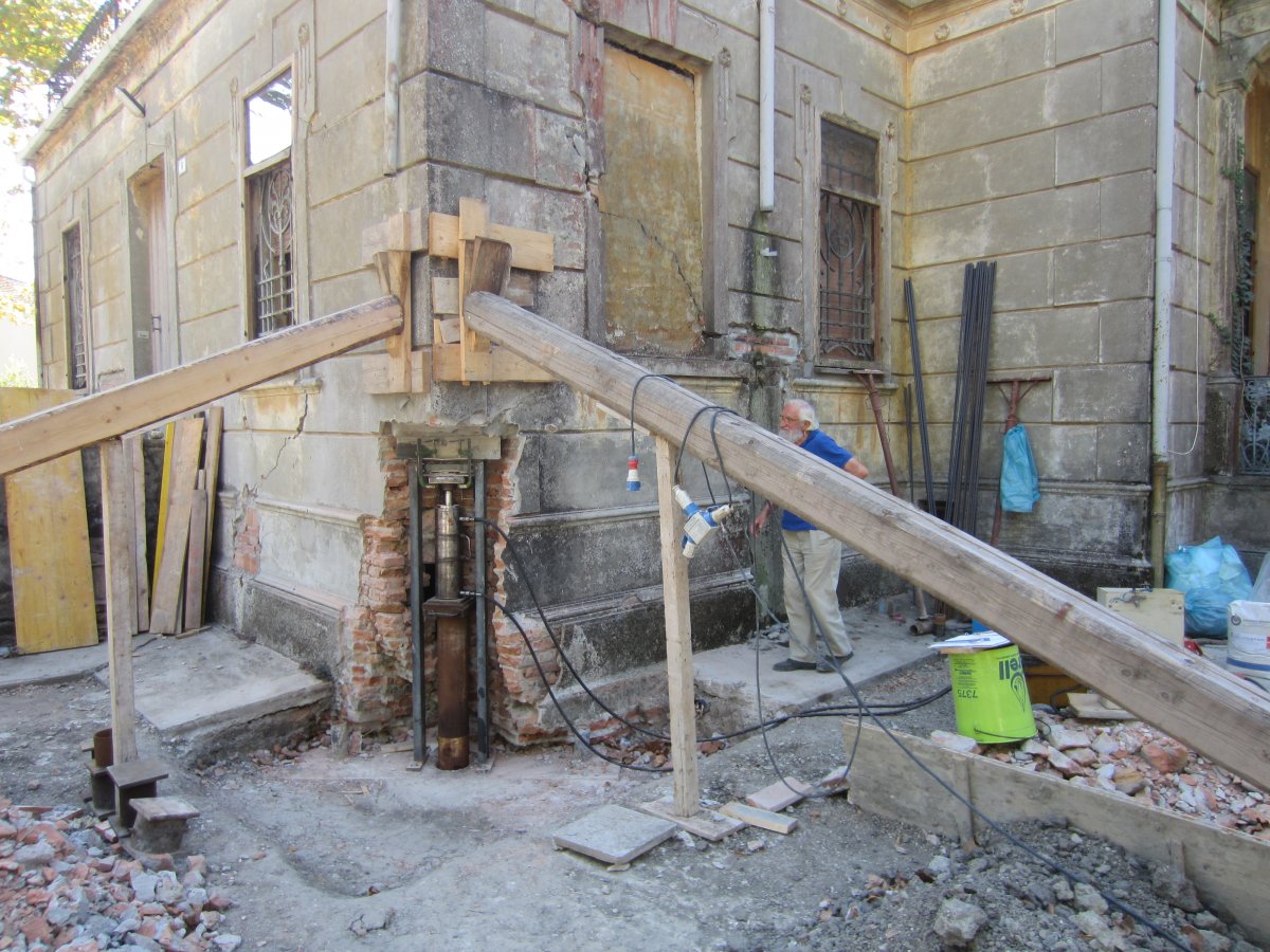 Consolidamento strutturale mediante pali a contrasto di un cedimento di fondazione.